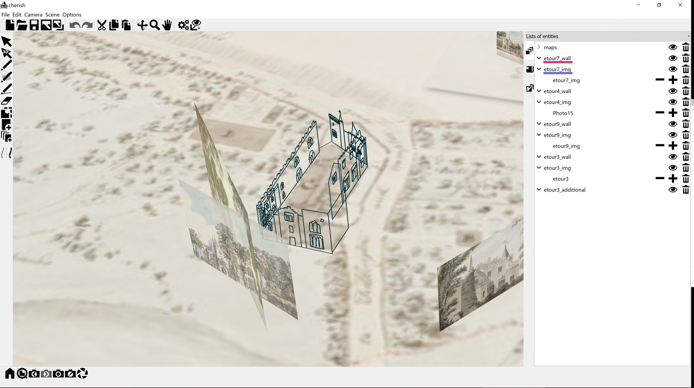 We present a work-in-progress report on a sketch- and image-based software called ''CHER-ish'' designed to help make sense of the cultural heritage data associated with sites within 3D space. The software is based on the previous work done in the domain of 3D sketching for conceptual architectural design, i.e., the system which allows user to visualize urban structures by a set of strokes located in virtual planes in 3D space. In order to interpret and infer the structure of a given cultural heritage site, we use a mix of data such as site photographs and floor plans, and then we allow user to manually locate the available photographs and their corresponding camera positions within 3D space. With the photographs' camera positions placed in 3D, the user defines a scene's 3D structure by the means of stokes and other simple 2D geometric entities. We introduce the main system components: virtual planes (canvases), 2D entities (strokes, line segments, photos, polygons) and provide a description of the methods that allow the user to interact with them within the system to create a scene representation. Finally, we demonstrate the usage of the system on two different data sets: a collection of photographs and drawings from Dura-Europos, and drawings and plans from Horace Walpole's Strawberry Hill villa.