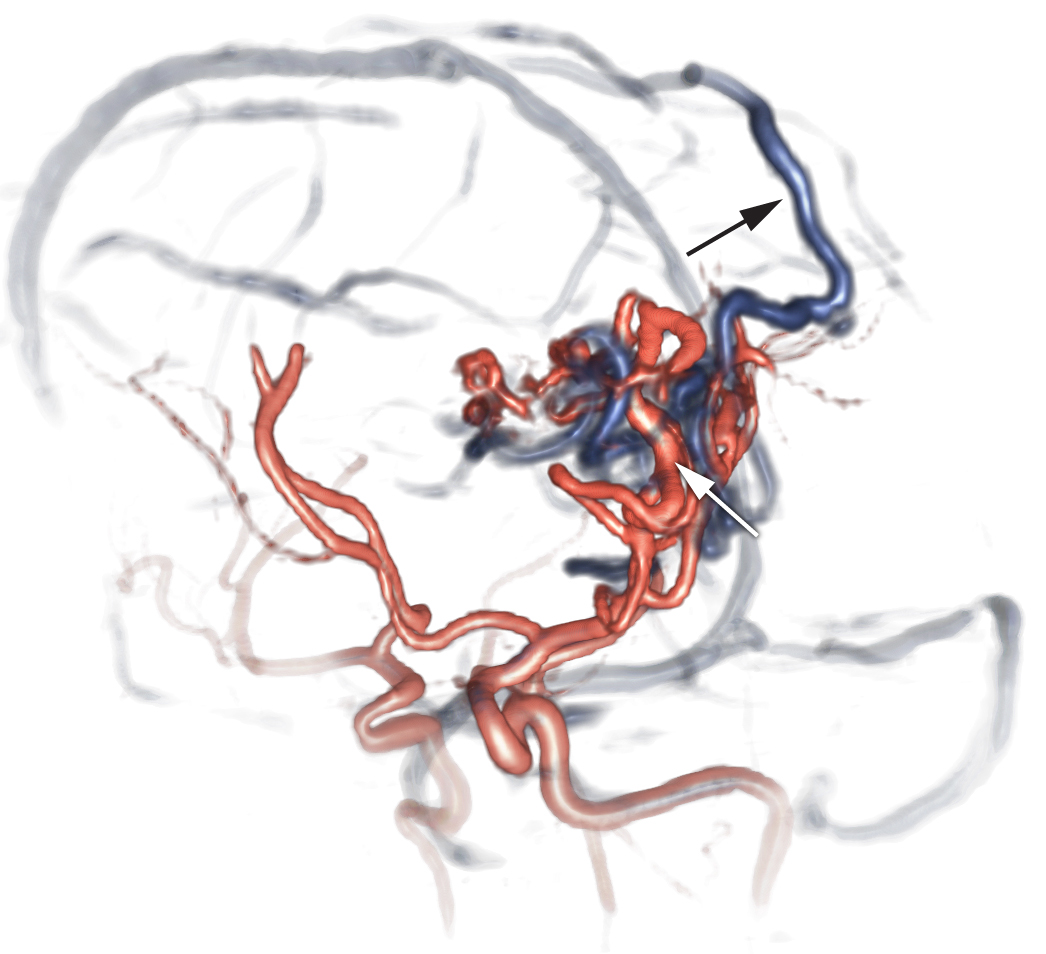 Arteriovenous malformations (AVMs) of the brain are rare vascular disorders characterized by the presence of direct connections between cerebral arteries and veins. Preoperative planning of AVM surgery is a challenging task. The neurosurgeon needs to gain a detailed understanding of both the pathoanatomy of the lesion as well as its location and spatial relation to critical functional areas and white matter fiber bundles at risk. A crucial element during this planning phase is the precise identification of feeding arteries, draining veins, and arteries en passage". To this end, a variety of imaging modalities for displaying neurovascular structures exists, both tomographic as well as projection based. However, the conventional 2D slice based review of such data is not well suited to help understanding the complex angioarchitecture of an AVM. In this paper, we demonstrate how stateof- the-art techniques from the fields of computer graphics and image processing can support neurosurgeons with the challenge of creating a mental 3D model of the lesion and understanding its internal structure. To evaluate the clinical value of our method, we present results from three case studies along with the medical assessment of an experienced neurosurgeon.