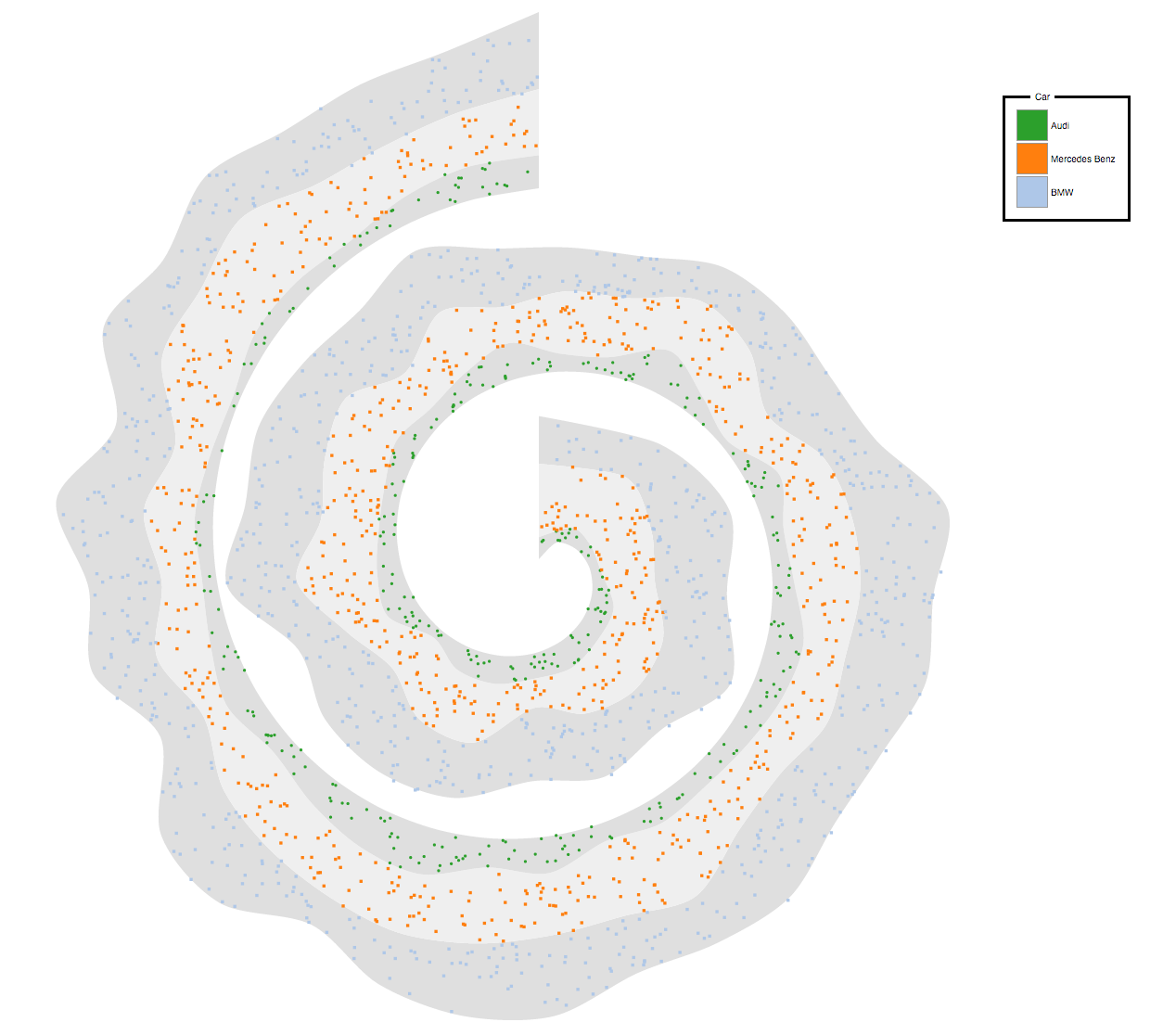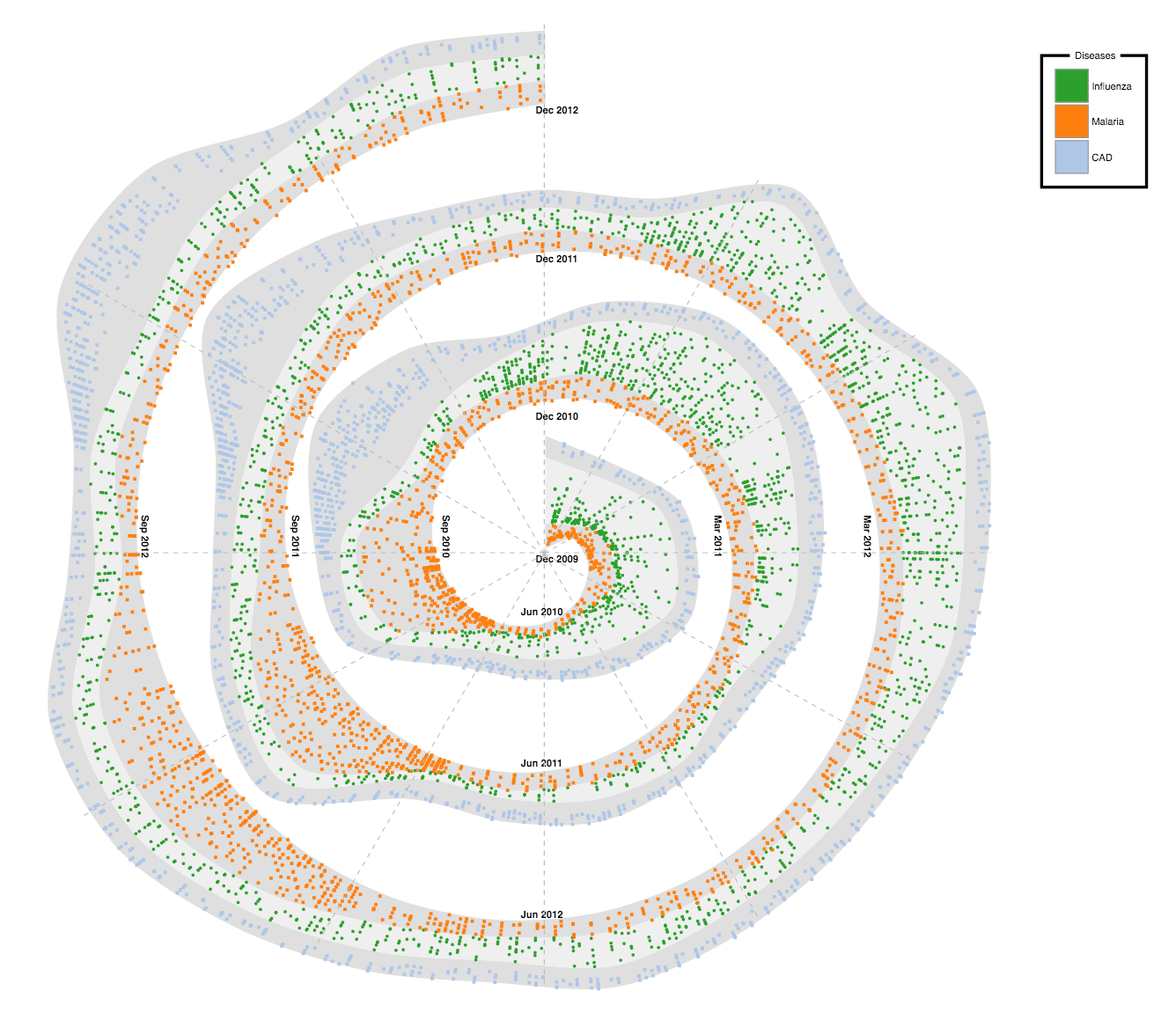We introduce a new visualization method for temporal data, Spiral Theme Plot, by combining ThemeRiver method, spiral patterns, and scatter plot technique. Similar to ThemeRiver, data in different categories (themes) are visualized in different bands, but also in a spiral pattern. Themes are stacked along a spiral curve, which represent the time axis. Individual data points are plotted within the regions of the themes, with various visual features. In addition to showing the overall theme patterns over time, this approach also shows plotting patterns within the themes. Compared to ThemeRiver, Spiral Theme Plot can accommodate longer time axis, and more importantly, can provide periodic patterns that are typically not available in ThemeRiver.
