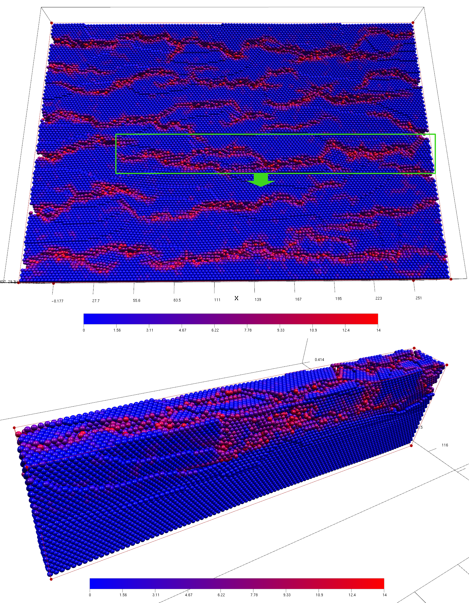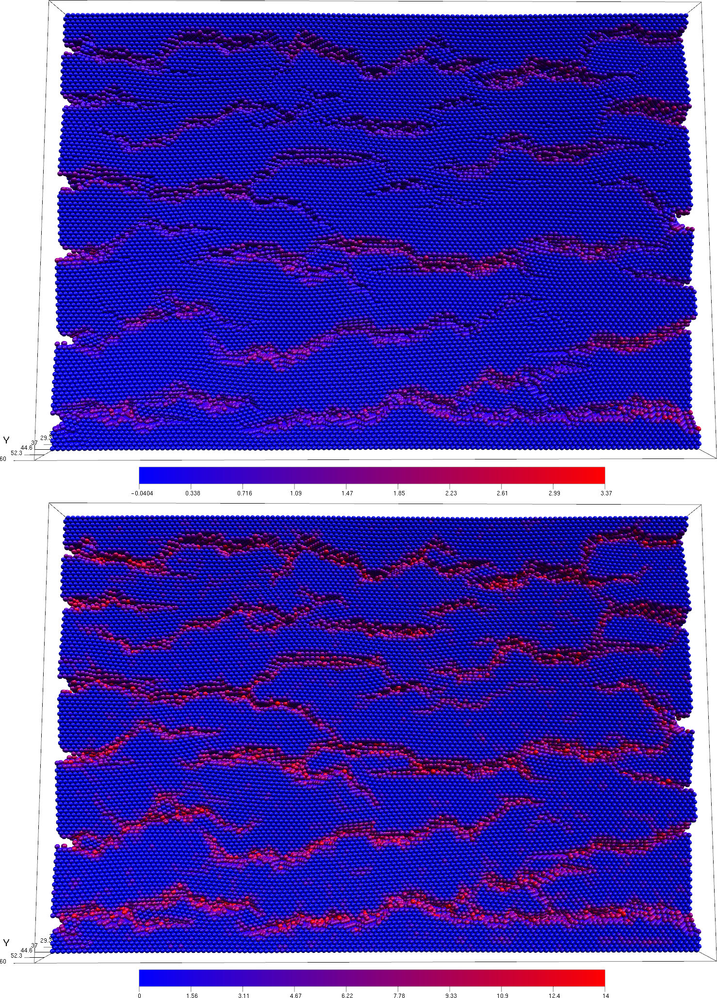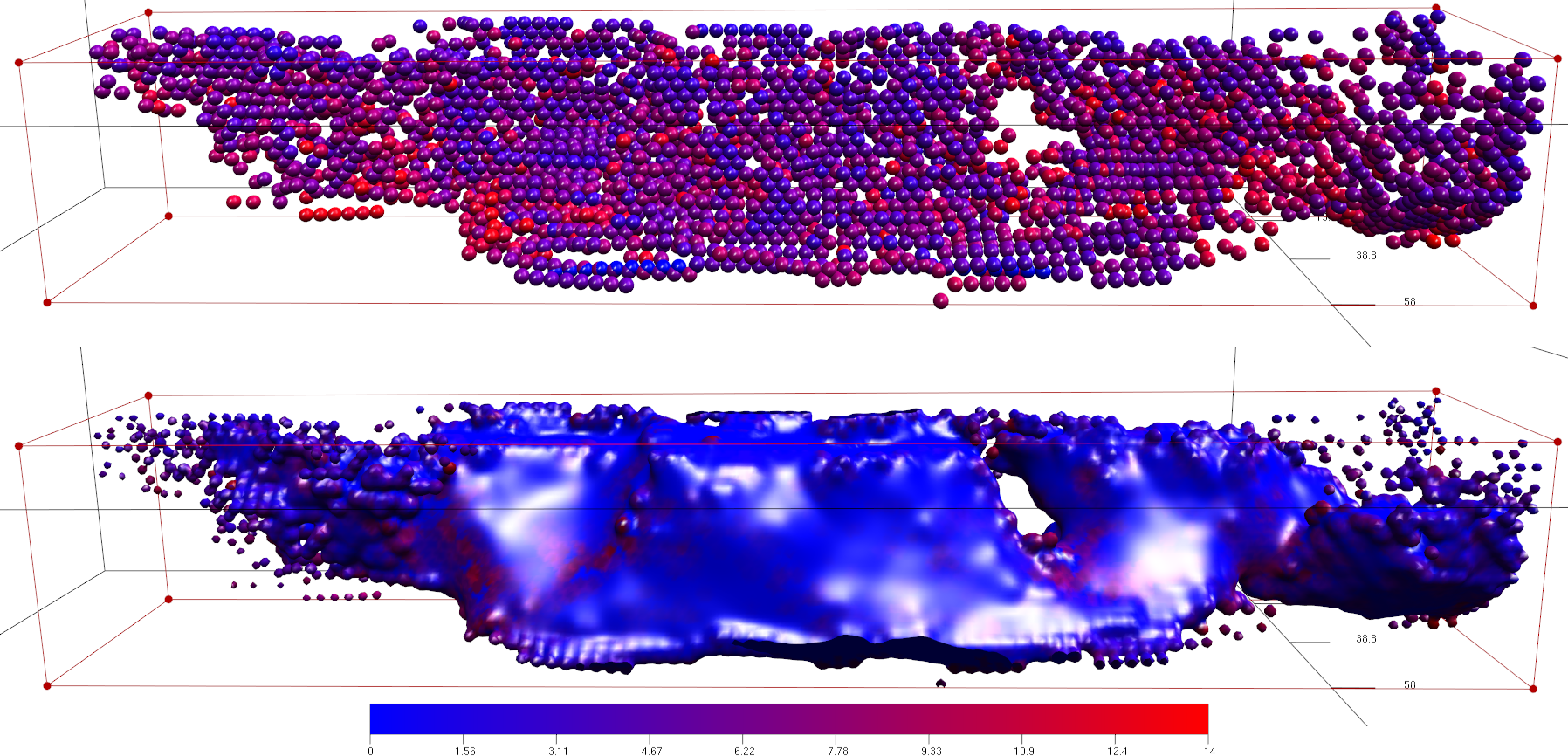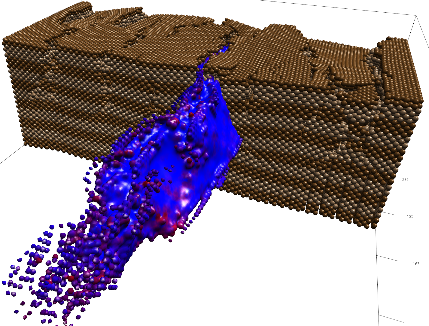 Discrete Element Modelling (DEM) is a numerical technique that uses a system of interacting discrete bodies to simulate the movement of material being exposed to external forces. This technique is often used to simulate granular systems; however by adding further elements that inter-connect the bodies, it can be used to simulate the deformation of a large volume of material. This method has precedent for use in the Earth Sciences and recently, with the increase of available computing power, it has been put to good use simulating the evolution of extensional faults in large scale crustal experiments that involve over half a million individual spherical bodies. An interactive environment that provides high quality rendering is presented, showing that interactivity is key in allowing the intelligent application of visualization methods such as colour-mapping and visibility thresholds in order to extract fault information from a geological DEM. It is also shown that glyph representation alone is not sufficient to provide full insight into the complex three dimensional geometries of the faults found within the model. To overcome this, a novel use of the MetaBall method is described, which results in implicit surface representations of sphere sub-sets. The surfaces produced are shown to provide greater insight into the faults found within the data but also raise questions as to their meaning.